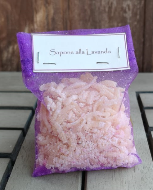 Sacchetto in organza contenente sapone in scaglie con note di lavanda, questo pot-pourri profumerà i piccoli ambienti, quali armadi e cassetti, in modo naturale e delicato.